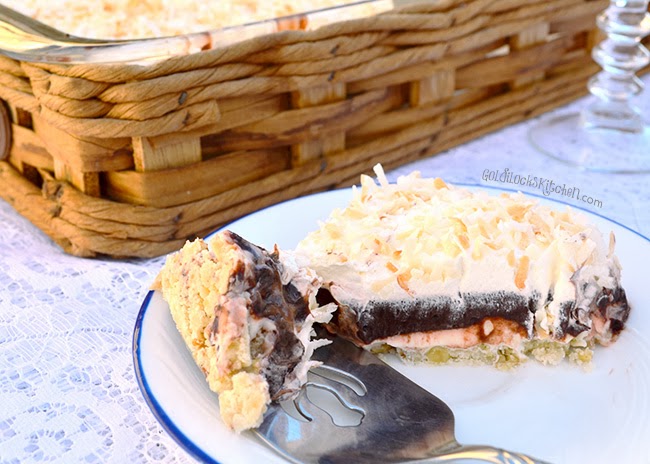 A delicious layer dessert, with chocolate pudding, whip cream, toasted coconut, and anchored with a light cookie crust. Great for a summer pic-nick or Sunday dessert.